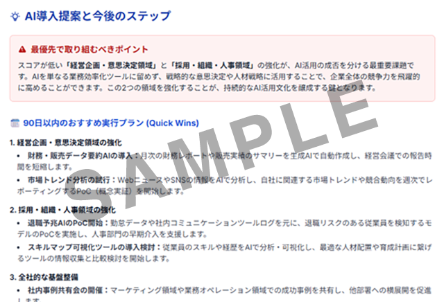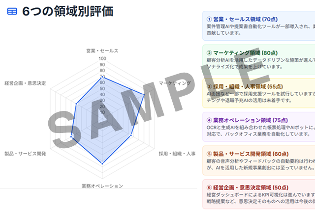 貴社のAI導入状況を5段階評価(L1〜L5)で可視化し、営業・業務効率・採用・経営管理など分野別の活用レベルと改善アクションが明確になります。