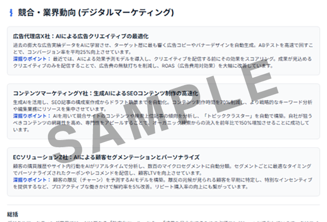 競合はAIによる広告文最適化やクリエイティブABテストを自動化していると明記されていたことで、経営層の理解と投資判断がスムーズになりました。