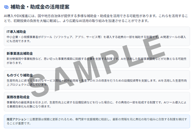 また、同業他社との比較スコアや、導入に最適なAIツールや補助金情報もレポートに含まれます。